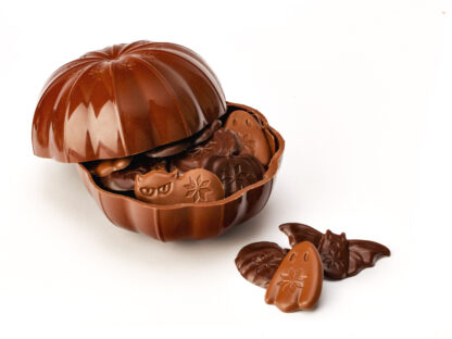 Retrouvez notre moulage citrouille au chocolat pour célébrer Halloween avec gourmandise ! Le moulage est garni de nos nouvelles fritures sèches d'Halloween au chocolat lait et noir.